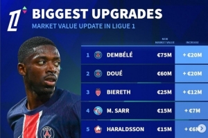 体育资讯3月25日讯 《转会市场》已经更新了法甲球员身价,并列出了升值最多榜单,巴黎7将在列。