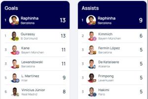 包揽金靴+助攻王?拉菲尼亚本赛季欧冠13球9助 双榜领跑&优势较大